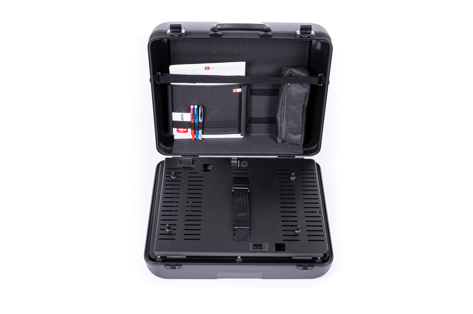 With the Mobiz Compact HP200 you have a case suited for laptops up to 17” in combination with the HP OfficeJet 250 mobile printer. The printercase is made of impact-resistant plastic (ABS). At the bottom the case has a compartment for the mobile HP OfficeJet 200 printer, which is closed off by a plateau. On this plateau laptops up to 17” can simply be placed. Thanks to this stacked setup you can work from the case. When the lid is removed the case can be positioned stably anywhere, even if the location does not have a good workplace. The case is provided with built-in power supply. The lid contains a large pen case and paper compartment. A strap has also been placed in the lid, fixating the notebook when the case is closed.