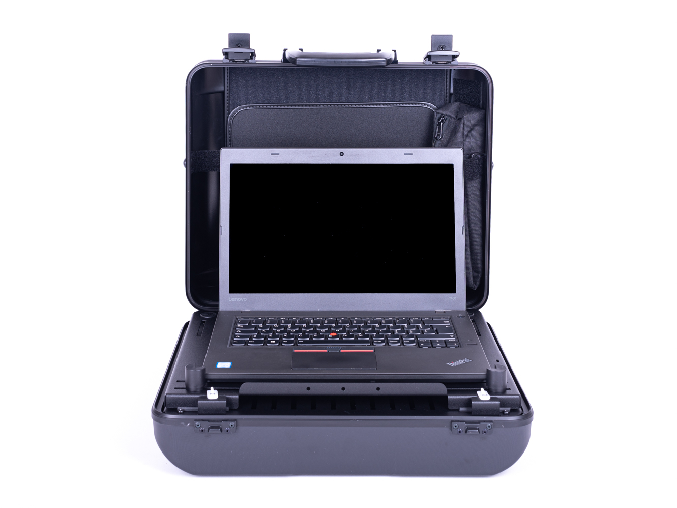Een grote etui en een papiervak zijn aanwezig in de deksel. De deksel is tevens voorzien van een band, waardoor bij het sluiten van de koffer de notebook gefixeerd wordt. De accu's kunt u laden door de ingebouwde stroomvoorziening en het meegeleverde netsnoer. Of in de auto op weg naar de volgende klant. Hiervoor heeft u dan wel een autolader nodig.